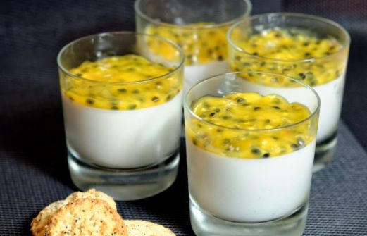 Préparation : 15 minutes Ingrédients (pour 4 personnes) : 40 cl de crème liquide 40 gr de sucre en poudre 2 feuilles de gélatine 4 fruits de la passion le jus d'une orange 5 gr de fécule Préparation : Faites ramollir la gélatine dans de l'eau froide. Por [...]