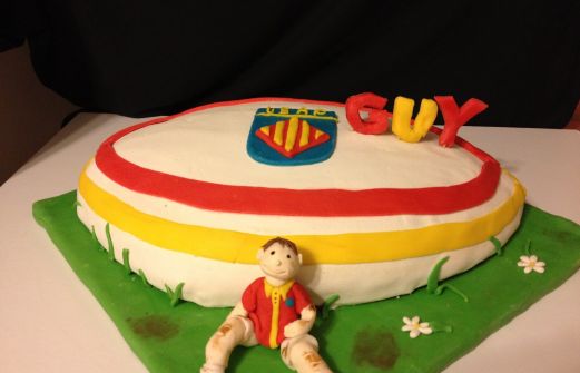 Pour l’anniversaire de mon père, fan de rugby et en particulier de l’équipe de l’USAP (Perpignan), j’ai voulu faire un gâteau ballon de rugby aux couleurs de son équipe préférée…