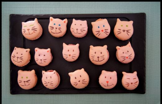 Les "chat-carons" à la framboise Aujourd'hui, j'ai réalisé des macarons en forme de tête de chat (pour le fun du dimanche ^^) garnie d'une gelée de framboise ! A adopter d'urgence ;) !