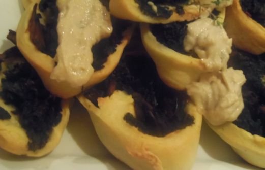 Une "pâte à tarte" abaissée (pour moi; 3 tasses de farine, 1\4 de tasse de Earth Balance, 2 cuillères à soupe d'huile d'olive, tout ça au robot, et puis de l'eau ajoutée petit à petit jusqu'à ce qu'une boule se forme) sur laquelle on dépose un mix de ce qui suit revenu à la poêle;