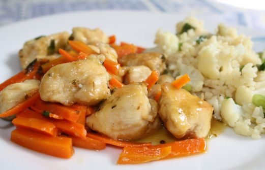 3 poitrines de poulet coupées en morceaux 1/2 tasse de farine sel et poivre 2 carottes en juliennes 1/4 tasse de beurre 1 c. tb. d'huile 1/4 tasse de vin blanc 1/2 tasse de bouillon de poulet 4 c. tb de jus de citron frais 1 c. thé de sucre 1 c. tb de persil frais haché Saler et poivrer les mor [...]