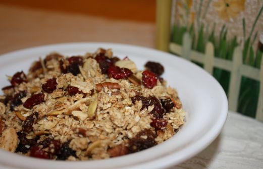 Base du granola: 4 tasses de flocons d'avoine 1 tasse de germe de blé (j'ai mit 1/2 son de blé et 1/2 son d'avoine) 1 tasse d'amandes effilées 1 tasse de noix de grenoble concassées 1/2 tasse de graine de lin (j'ai mit graine de chia) 1 tasses de noix de coco râpée non-sucrée 3/4 c. thé de sel [...]