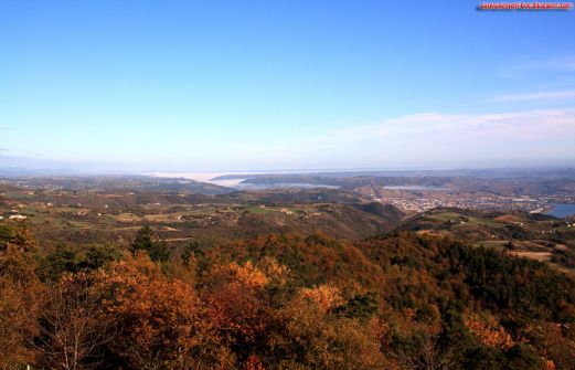 La vallée du Rhône, au dessus de Valence. Devant, les chênes pubescents (quercus pubescens) prennent leurs couleurs automnales, plus loin et plus bas, derrière les pins, le vert uniforme des collines trahit la présence des chênes verts (quercus ilex). Alors que presque partout, le vert dispa [...]