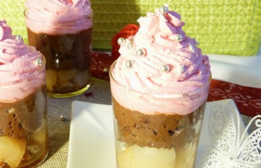 Ingrédients : Biscuits speculoos 1 tasse de café Sucre semoule Beurre Poires Pour la mousse à la fraise Mascarpone Confiture de fraises Sucre glace Vanille liquide Colorant alimentaire rose Pour la Chantilly Crème fluide Elle et vire au mascarpone 1 sachet de c [...]