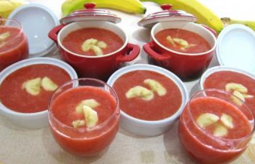 Éplucher l'orange, couper en morceaux. Laver avec les queues les fraises, équeuter , couper en deux. Laver, brosser, le citron vert. Presser le jus de citron vert, peser . Dans le bol du blender , verser l'orange, le jus de citron vert, les fraises, hacher . [...]