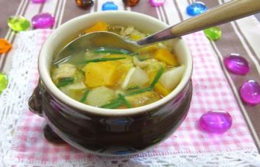 Éplucher la carotte, laver sous l'eau froide, couper en dés. Éplucher les gousses d'ail. Couper les gousses d'ail en lamelles. Couper les morceaux de poulet en morceaux. Éplucher la pomme de terre, laver sous l'eau froide. Tailler les pommes de terre en dés, placer d [...]