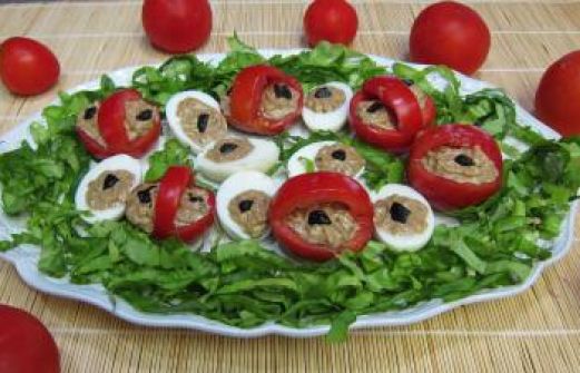Merci pour cette recette d'oeufs farcis ; tu adores la sauce tomate , tu en mets partout. Je reconnais que c'est très bon. Préparer la mayonnaise , laver les tomates, enlever le pédoncule et commencer les petits paniers. Sur le côté bombé de la tomate , faire 2 incisions à mi-hau [...]