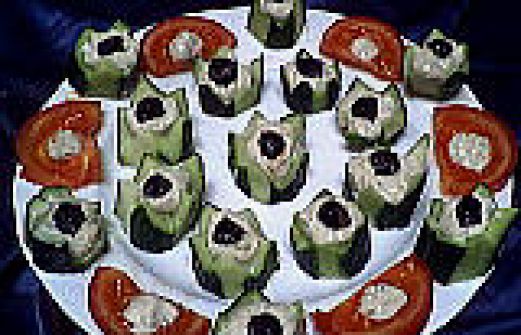 Enlever 4 bandes de peau au concombre ou tracer des rainures à intervalles réguliers à l'aide d'un couteau économe ou d'un canneleur. Eplucher l'échalote. Couper le concombre en tronçons de 3 cm en les historiant . Creuser légèrement le centre avec une cuillère pomme noisette ou [...]