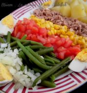 Nombre de personnes - + 1 concombre 9 tomates 5 oeufs durs 1 branche de céleri 1 poivron vert long 8 cébettes (petits oignons) 260 g de thon à l'huile d'olive (ou anchois) soit 2 boîtes 1/2 botte de radis 20 g de oli [...]