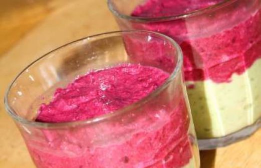 Mousse davocat: * 1 avocat bien mûre * 3 cuillere à soupe de crème liquide * 1 gousse d' ail * 1 c. à soupe de jus de citron * 1 pincée de sel Mousse de betterave: * 2 moyennes betterave s cuites et épluchées * 3 c. à soupe de crème liquide * 1 pincée de poivre Préparation Po [...]