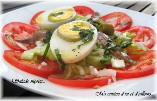 4 tomates 4 oeufs durs 12 filets d' anchois 1 concombre 1 poivron vert 1 gros oignon frais 10 feuilles de basilic 1 gousse d'ail Des olives noires 3 cuillères à soupe d'huile d'olive Préparation Pelez le concombre, épépinnez-le et détaillez-le en lamelles. Salez-le et laisse [...]