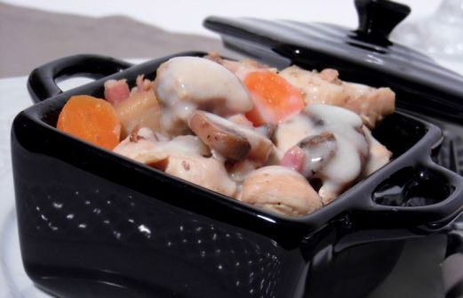 800 g de blanquette de dinde 100 g de champignons de paris (en boite, ou frais) 100 g de lardons 1 oignon 1 clou de girofle 1 cube de bouillon de volaille 1/2 poireau 2 carottes (petites) 1 bouquet garni 15 cl de crème liquide 30 g de beurre (+ 1 noix) 2 c às de farine Eau H [...]