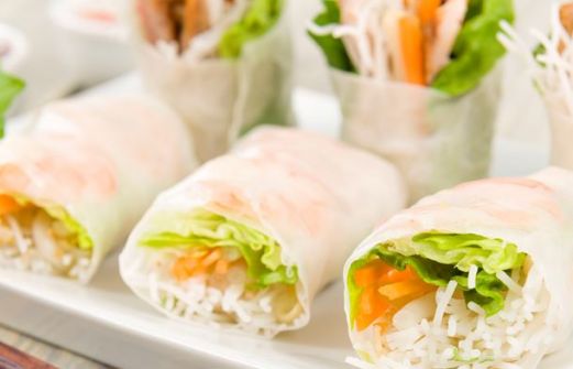 8 galettes de riz 8 grosses crevettes roses 1 boîte de pousses de soja (environ 175 g) 2 carottes 1/2 poivron 1 gousse d'ail 4 belles feuilles de salade (laitue, batavia, feuille de chêne blonde) 8 feuilles de menthe jus d'un citron quelques feuilles de coriandre f [...]