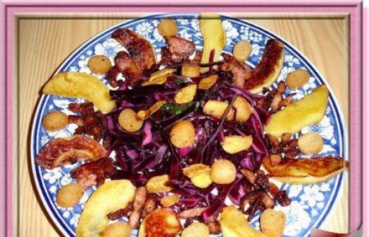 - Chou rouge - 2 pommes - 1 noisette de beurre - 200 g de lardons - 3 gousses d'ail - 6 cuillères à soupe d'huile - 3 cuillères à soupe de vinaigre - 1 oignon rouge - Sel, poivre , maggi - Petits croûtons à l'ail Préparation Etape 1 Émincer le chou, le plus finement possible, [...]