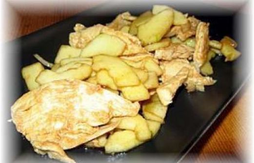 3 escalopes de poulet 1 beau concombre 2 oignons nouveaux 1/2 tablette de bouillon de volaille 1 cuillère à café de gingembre en poudre 1 cuillère à café de sucre en poudre 3 cuillères à soupe de sauce soja 2 cuillères à soupe d'huile de tournesol 1 cuillère à café d'huile de sésa [...]