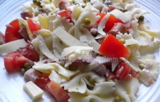 500 gr de farfalle (ou autres pâtes) 3 tomates 1 boîte de petits pois extra fins 1 boîte de petites saucisses 200 gr de dés de jambon 200 gr de gruyère ne bloc Parmesan en copeaux Mayonnaise Préparation A la sortie de l'hiver, on a envie d'un peu de fraîcheur. Alors voici une [...]