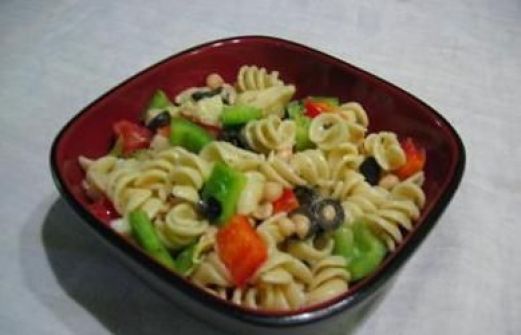 454 g de pâtes rotini (1lb) 60 ml d' huile d'olive (¼ tasse) 1 cuillère à soupe de vinaigre de vin rouge (15 ml) 2 cuillères à thé de poudre d' ail Sel Poivre 1 poivron vert (en morceaux) 1 poivron rouge (en morceaux) ¼ tasse de basilic frais, haché (ou ½ à 1 cuillère à thé de bas [...]