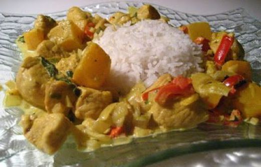 - 1 1/2 lb de poitrines de poulet désossées, sans la peau en cubes de 1 1/2 pouces ou 4 cm - 2 cuillères à soupe d'huile d'olive - Sel - poivre - 1 gros oignon , émincé - 4 gousses d' ail , émincées - 1 poivron rouge haché - 1 jalapeno haché - 1 cuillère à soupe de gingembre frais é [...]