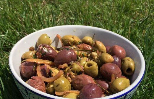 200 g d'olives vertes dénoyautées 200 g d'olives meski violettes le zeste de 2 citrons jaunes 20 cl d'huile d'olive 2 branches de romarin frais 5 branches de thym frais 1 c. à café de graines de fenouil 2 gousses d'ail 1 piment rouge 1 g de sel Pr [...]