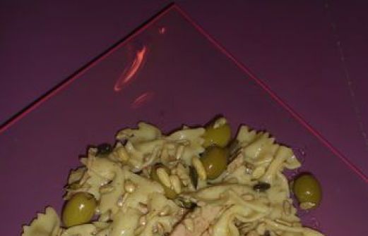 - 200 g de pâtes Farfalle - 2 cuillères à soupe d' olives vertes dénoyautées - 1 escalope de poulet coupé en petits morceaux - 2 cuillères à soupe d'un mélange de graines de tournesol, courges et pignons de pin - huile d'olives au citron, vinaigre balsamique Préparation Etape 1 [...]