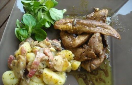 - 300 g d'aiguillettes de canard - une échalote +un oignon - huile d'olive - vinaigre balsamique - poivre en grains - sel Pour la poêlée : - 6 pommes de terre moyennes cuites - 100 g de lardons fumés - 200 g de champignons de paris - sel - poivre Préparation Etape 1 Fai [...]
