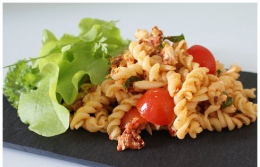 - 300 g de pâtes (des Tortis pour ma part) - 2 poignées de pignons de pin (soit environ 30 g) - 170 g de tomates cerises (une petite vingtaine) - 25 g de chorizo - 50 g de bûche de chèvre - 4 pétales de tomates séchées à l’huile d’olive - 5 feuilles de basilic - Sel - poivre - Une [...]