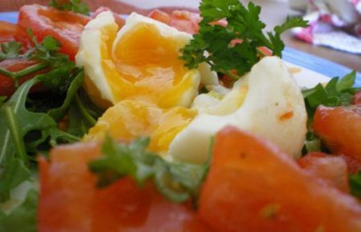- 4 tomates bien mures - 1 poignée de roquette - 2 oeufs - 1 échalote - 1 brin de persil - Fleur de sel - Poivre - Vinaigre de cidre - 2 cuillères à soupe d'huile de noix . Préparation Etape 1 Faire cuire les œufs pendant environ 6 minutes, puis les laisser refroidir. Etape [...]