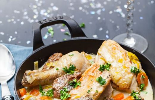 1 chapon 2 oignons 3 carottes 1 poireau 2 càs de farine 25 cl de vin jaune 1 bouquet garni (laurier, thym, persil) 40 cl de bouillon de volaille 150 g de morilles surgelées 30 cl de crème fraiche 30 g de beurre 1 branche de persil sel, poivre Prép [...]
