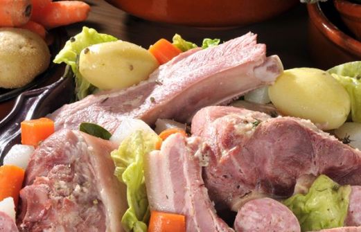 2 kg de palette demi-sel 800 g de travers de porc demi-sel Poitrine de porc fumée 1 bouquet garni (persil, thym, laurier) 1 oignon 2 clous de girofle 2 gousses d'ail 2 saucisses de Morteau 1 chou frisé 8 poireaux 8 carottes 8 navets 8 pommes de terre 25 [...]