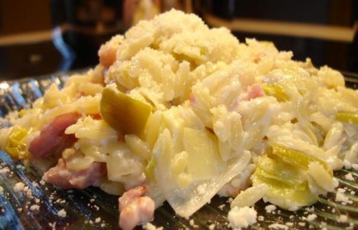 - 4 blancs de poireaux lavés et coupés finement en lamelles - 200 g d'Orzo (pâtes en forme de riz) - 15 cl de crème liquide - 1 tranche de roquefort (environ 100 g) - 1 poignée de gruyère râpé - 200 g de lardons - sel et poivre Préparation Etape 1 Verser les poireaux dans une c [...]