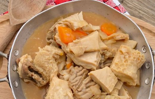2 kg de tripes prêtes à cuire 2 carottes 2 gros oignons 1 blanc de poireau 1 bouquet garni 3 gousses d'ail 1 boîte de tomates pelées 30 cl de vin blanc sec 6 c. à café de fond de veau déshydraté 1 morceau de sucre 25 g de beurre chaud sel, poivre Pré [...]