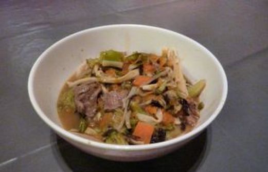 - 1 aillet - 2 petits poireaux , le tout émincé - 2 cuillères d'huile d'arachide - 2 cuillères à soupe de sauce tamari - 1 cuillère à soupe de sauce à l’huître - 1 cuillère à soupe de bouillon de légumes - 2 carottes coupées en tagliatelles - 200 g de bouquet de brocolis - 100 g de p [...]