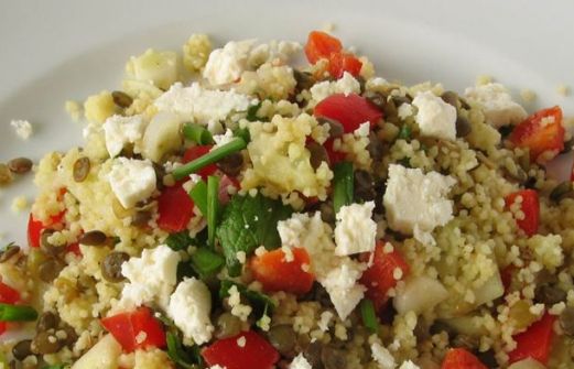 110 g de lentilles vert-brun (sèches) 160 g de couscous 260 g de concombres 200 g de poivrons jaunes ou rouges 60 g de oignons verts/échalotes 65 ml de huile d'olive extra vierge 1 1/2 citron de citron pressé en jus 10 ml de moutarde de Dijon 100 g de fromage féta [...]