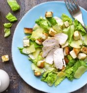 4 escalopes de poulet 1 salade 2 tranches de pain de mie 3 c. à soupe de jus de citron 1 c. à café de moutarde 2 c. à soupe d’huile d’olive 1 c. à soupe d’eau sel, poivre Préparation ÉTAPE 1 Faites cuire les escalopes dans une poêle sans matière grasse. Coupe [...]