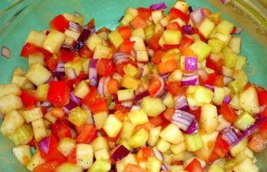 - 2 tomates - 1/2 concombre - 1 gros oignon rouge - 1 pomme Granny Smith - 2 cuillères à café d'huile d'olive - 2 cuillères à café de jus de citron cumin piment en poudre (facultatif) - sel, poivre Préparation Etape 1 Peler la pomme, le concombre et l'oignon; les couper, ainsi [...]