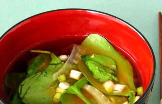 10 g de miso (pâte de fèves de soja fermentées) 375 ml de eau 30 g de oignons verts/échalotes 28 g de champignons de Paris (blancs) 6 g de bébé épinards Préparation ÉTAPE 1 Porter l'eau à ébullition. Dans chaque bol délayer 1 cuillère à thé de miso avec un peu d'eau c [...]