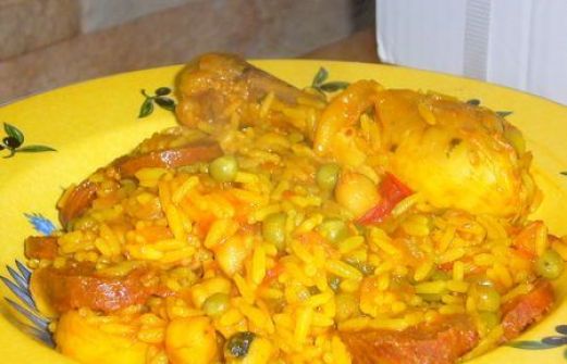 - 10 cuisses de poulet - 1 saumon (même conglé) - 1 kg de coques - 1 kg de moules - huile d'olive - 2 oignons moyens - 1 poivron vert - 1 poivron rouge - 1 chorizo fort - 1 grosse boîte de tomates pelées - thym et persil en bottes - 1 petite boite de pois chiche - 1 petite boî [...]
