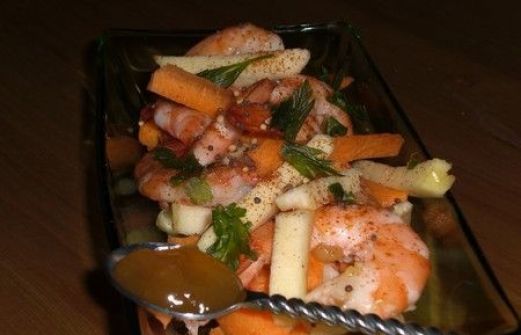 - 8 crevettes décortiquées (sauf la queue pour faire chouli) - du chutney de mangue (env. 2 Cuillères à Soupe) - 1/2 pomme coupée en julienne - 1 petite carotte coupée en julienne - 1/2 Cuillère à Café de paprika - 1/2 Cuillère à Café de graines de moutarde - un peu de coriandre gro [...]