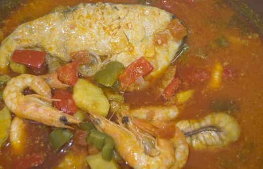 2 tranches de poisson blanc 20 crevettes ½ poivron vert coupé en cubes ½ poivron rouge coupé en cubes 1 patate douce pelée et coupée en gros dés 1 oignon émincé 1 tomate détaillée en cubes 2 gousses d’ail écrasées 2 dl de lait de coco 3 c à soupe d’huile de palme sel et piment [...]