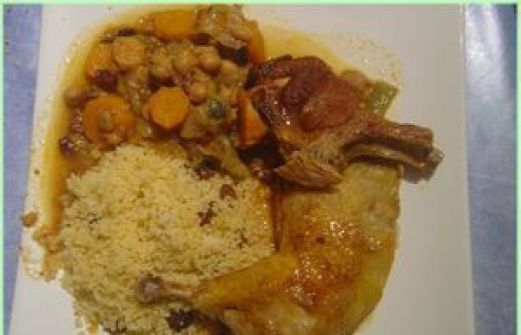 - 4 cuisses de poulets - 4 morceaux de mouton - 4 merguez - 3 carottes - 3 navets - 3 courgettes - 1 oignon - 500 g de semoule couscous - 1 boîte de pois chiches (1/2) - 1 poivron vert - 1 poivron rouge - 1 tasse de raison sec - De la coriandre - Clou de girofle - 1 cuillère [...]