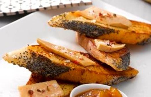 1 baguette Rétrodor au pavot 100 g de foie gras 100 ml de lait 100 ml de crème 25 g de floc de Gascogne 1 oeuf 100 g d'abricots secs 20 g de miel 1 échalote 1 gousse d’ail 40 g de gingembre confit 20 ml de vinaigre de xérès curry muscade beurre se [...]