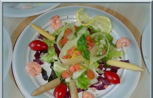 - 1 concombre - 100 g de saumon fumé coupé en cubes - 4 belles crevettes par assiette - 1 bocal de tête d' asperges - 1 bocal d'épis de maïs - 3 mini tomates Roma en grappe par assiette - 1 citron - Basilic frais - 1 vinaigrette à laquelle vous aurez ajouté de la crème fraîche et [...]