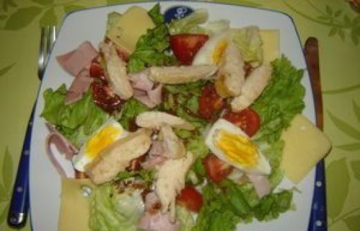 - salade - 2 escalopes de poulet - 2 oeufs - 2 tranches de jambon blanc - des tomates cocktail - de l' emmental en tranche - moutarde à l'ancienne - vinaigre balsamique - huile d'olive Préparation Etape 1 Faire cuire les œufs durs. Les laisser refroidir puis les écaler et l [...]