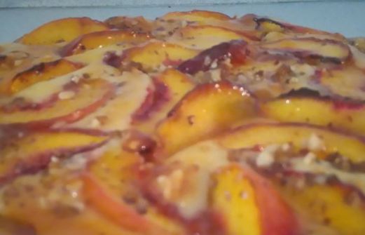 1 pâte feuilletée 200 grammes de mascarpone 100 grammes de sucre 2 oeufs 15 grammes de farine 4 pêches jus de citron mélange maison de noisettes, pralin et amandes caramélisés à la poêle et concassés 20 grammes de sucre 50 grammes confiture d'abricots [...]