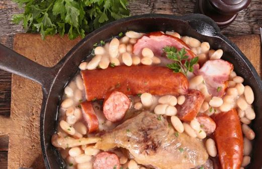 500 g de confit de canard + sa graisse 500 g d'épaule d'agneau désossée 300 g de collier d'agneau 1 saucisson à l'ail cru 1 saucisse de Toulouse 750 g de haricots blancs secs tarbais, coco ou lingots 150 g de lard maigre 1 morceau de couenne à la taille du fond de la coc [...]