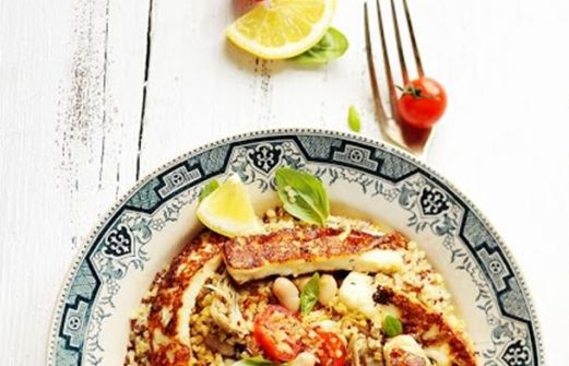 150 grammes de quinoa 8 coeurs d'artichauts 12 tomates cerise 150 haricots blancs en boîte 4 tiges de basilic 1 c. à soupe de câpres 1/2 c. à café de zeste de citron râpé 360 grammes de grillis Salakis 2 c. à soupe d'huile d'olive Sel Poivre P [...]