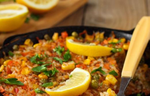 350 g de riz rond espagnol 250 g de champignons de Paris émincés 1 poignée de haricots verts équeutés 150 g de petits pois écossés 400 g de tomates concassées en boîte 150 g noix de cajou non salées 1 petit poivron rouge 1 petit poivron vert 2 oignons 2 gousses d'a [...]