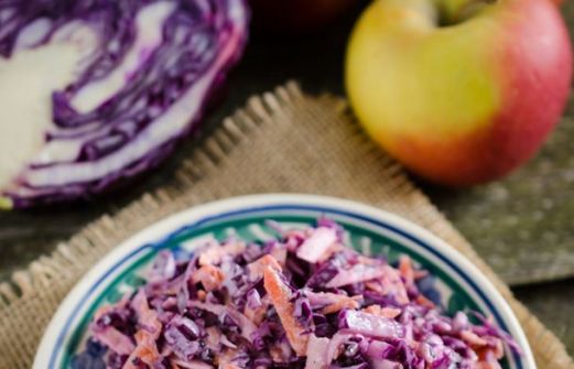 1,5 tasse de chou rouge râpé 1 demi-pomme râpée 1 carotte râpée 1 échalote hachée finement 1 c. à table de persil frais haché 2 c. à soupe de mayonnaise 2 c. à soupe d'huile d'olive 1 demie c. à café de sirop d'érable 1 c. à café vinaigre de cidre 1/4 c. à café d'a [...]