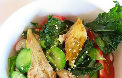 2 mini concombres 3 petites tomates 5 à 10 radis Fenouil 1 oignon frais Poulet rôti 2 c. à soupe algues désydratées 1/2 c. à soupe graines de sésame 1 c. à soupe sauce soja 1 c. à soupe vinaigre de riz 1 huile de sésame ou huile d'olive Chips de ch [...]