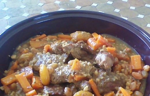 1,2 kilogrammes D'épaule d'agneau désossée 1 kilogrammes De carottes fannes 100 grammes De raisins secs 100 grammes D'amandes mondées 12 Abricots secs 3 Oignons 2 Gousses d'ail 1 Bouquet garni 1 c. à café De graines de coriandre pilées 1 c. à café De cumin [...]